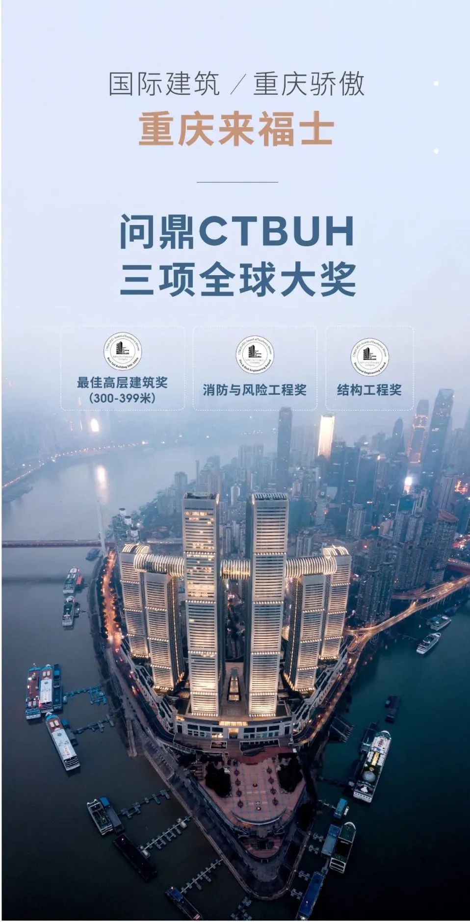 2020年11月18日当选成渝十大文旅新地标,荣获世界高层建筑与都市人居学会(CTBUH)2021年高层建筑全球奖——最佳高层建筑消防与风险工程奖结构工程奖三项大奖。
